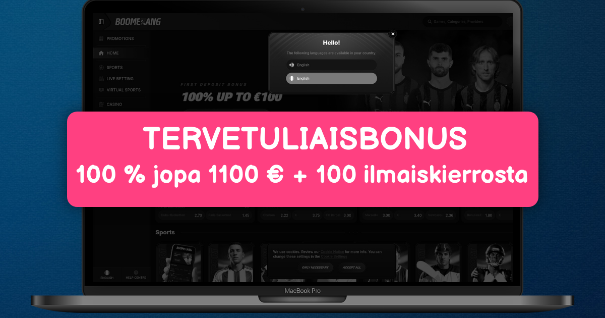Uudet pelaajat saavat Boomerang Betissä vaikuttavan tervetuliaispaketin, joka voi sisältää jopa 300% talletusbonuksen ensimmäisestä talletuksesta. Kokonaisbonussumma voi nousta 500 euroon asti, ja mukana tulee usein 200 ilmaiskierrosta suosituimpiin kolikkopeleihin.